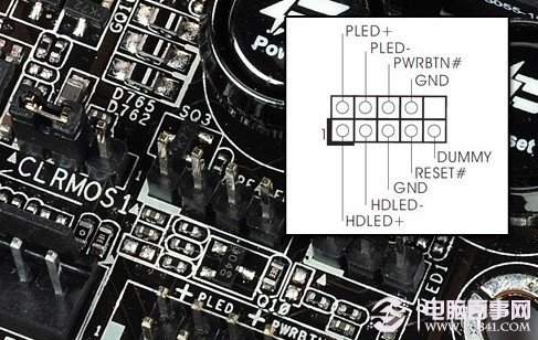 最后介绍下主板跳线,这也是很多新手朋友装机十分头疼的问题,主要是涉及到电源机箱开机按钮、重新启动按钮以及机箱电源指示等线的连接。接法对照如下图: